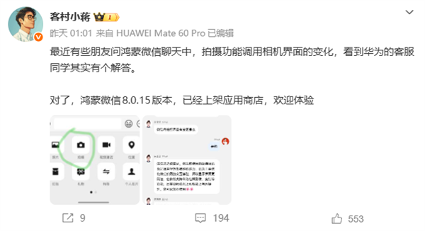 澳门新浦京游戏app 官方回话微信鸿蒙版相机界面变化:仍调用华为系统相机、性能提高